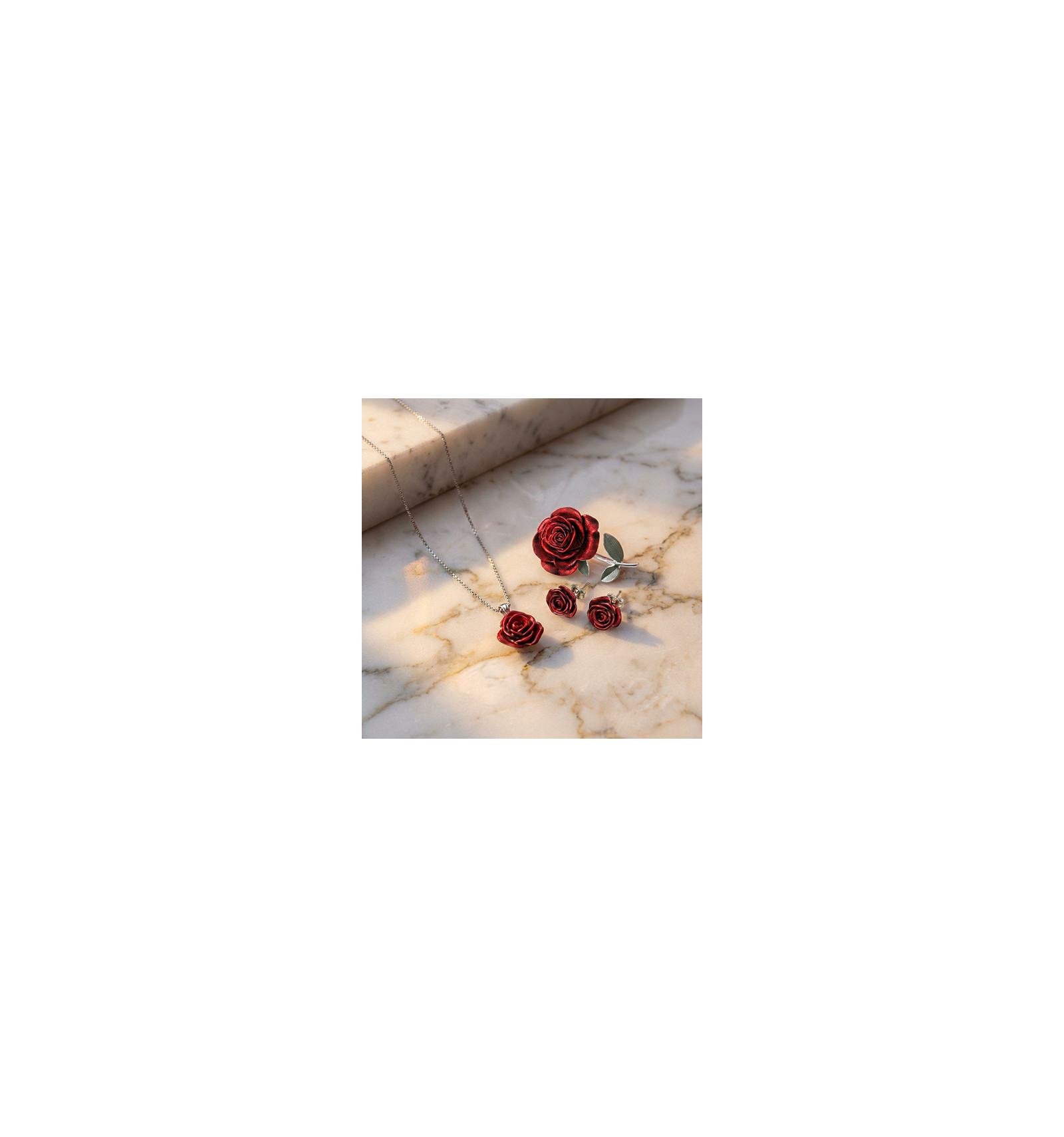 Cette parure rassemble le pendentif rose, les boucles d’oreilles boutons de rose et la broche feuillagée, créant une harmonie délicate autour de la rose.
