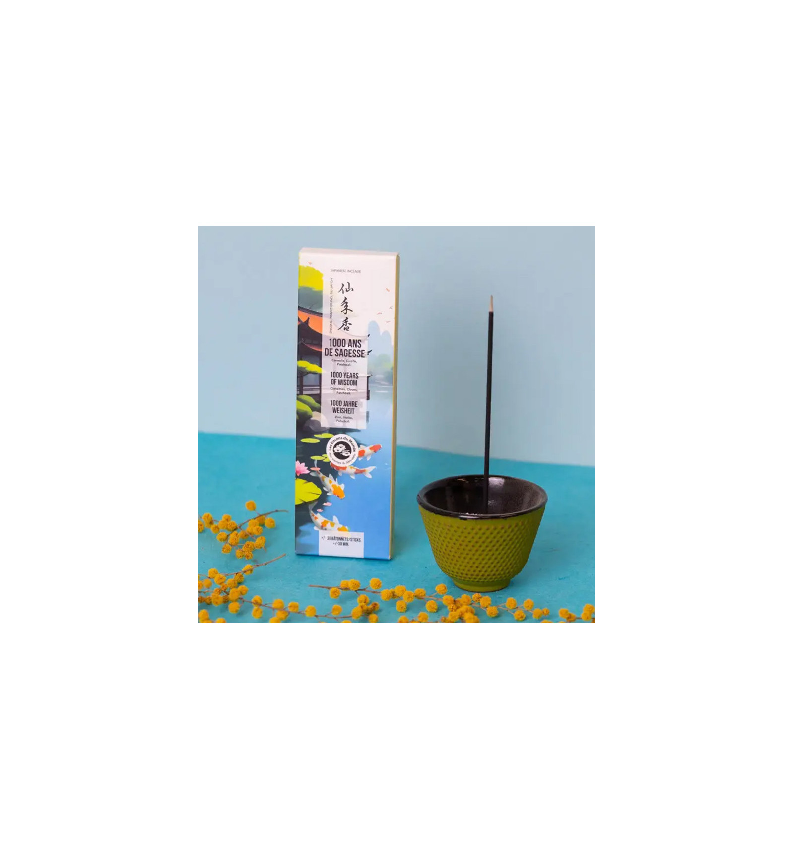 Fabrication : Réalisé au Japon, dans le respect des traditions ancestrales. Chaque bâtonnet est ensuite emballé en France dans un atelier favorisant l'insertion professionnelle, garantissant ainsi une fabrication éthique.