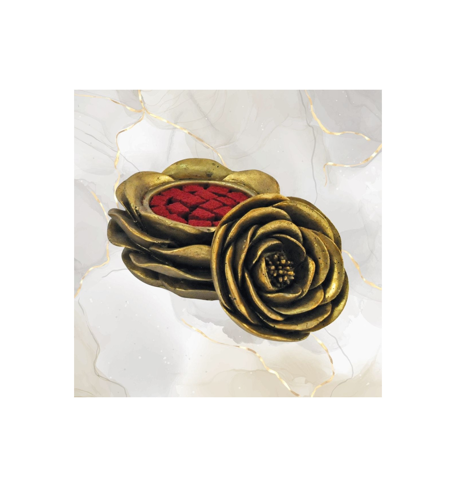 L’encens à la rose intègre dans sa composition du benjoin de Sumatra, de l’encens du Soudan, de la poudre d’iris, de la myrrhe, de la fleur et des boutons de rose, ainsi qu’une essence de rose rouge.